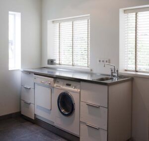 dialogue between aluminium and wood, the cupboards explore the balance between
